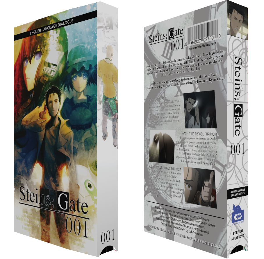 A custom VHS tape made using the first 3 episodes of "Steins;Gate". All of the video editing, such as pan & scanning, graphics, and text, were done by me. The packaging design was also done by